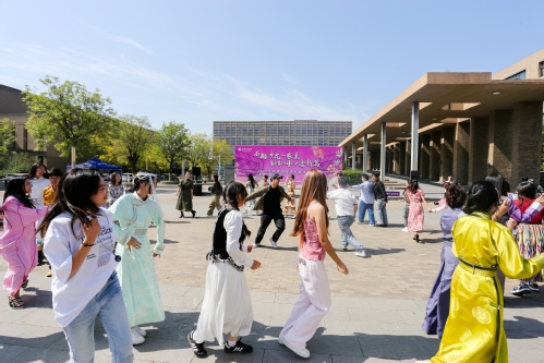 舞台中央,文艺展演率先点燃了全场热情。身着各色民族盛装的学子们轮番登场,或舞姿翩跹,展现草原的辽阔与雪山的圣洁;或琴声悠扬,奏响天山脚下的欢歌与延边田野的韵律。紧接着,一阵铿锵的鼓点引来满场喝彩——天津陈台子同乐高跷老会的非遗传承人们,脚踏数尺高跷,身着斑斓彩装,在方寸间腾挪翻转,将武术的刚健与民俗的趣味完美融合,引来师生们阵阵喝彩。