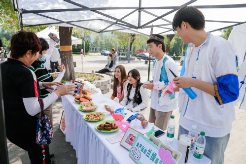 广场四周,互动体验区同样热火朝天。空气中弥漫着烤馕、糌粑等民族美食的诱人香气,绣花、编织等传统手工艺展位前围满了好奇的同学。而在民族团结趣答题区域,学生们争相抢答,在趣味互动中加深了对多彩中华文化的认知与认同。